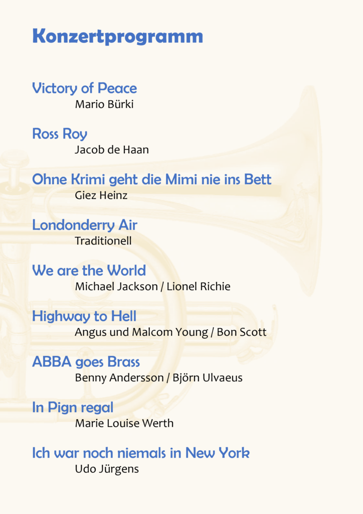 Das ist die Grundidee unseres diesjährigen Konzerts. Wir schauen zurück auf die vergangenen zwanzig Jahre. Beim Durchstöbern des Notenarchivs waren wir erstaunt über die vielfältige und überaus interessante Musikliteratur, die sich all die Jahre ansammelte. Führten wir die Musikstücke wirklich alle auf? Unglaublich! Aus dieser grossen Anzahl trafen wir eine klitzekleine Auswahl.